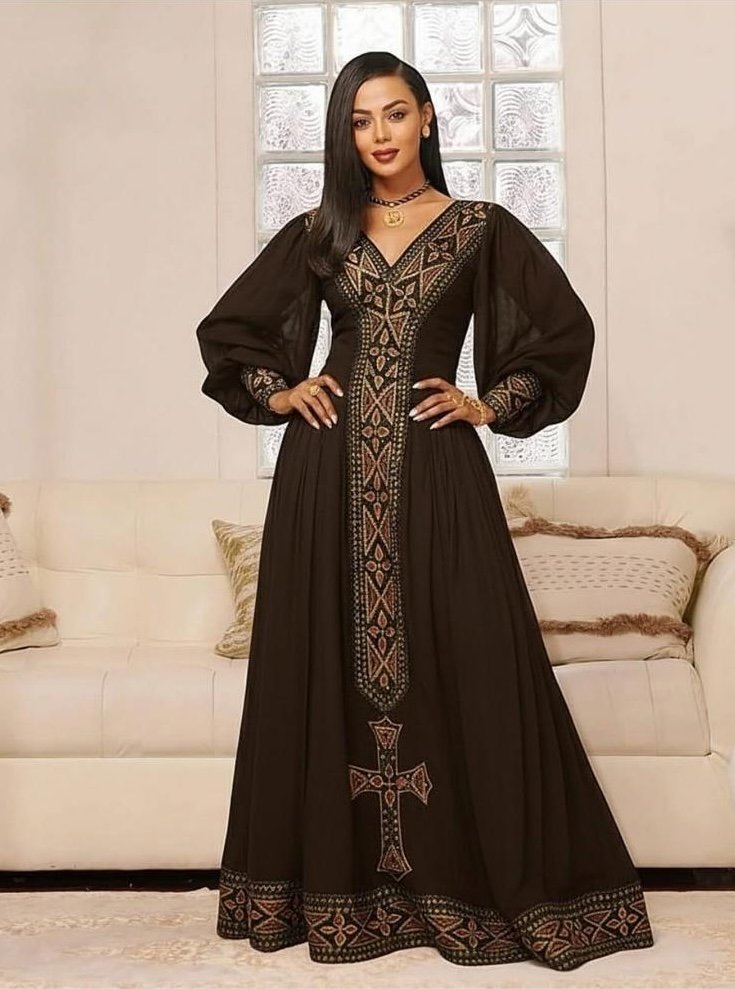 Modern Gondar Ethiopian Dress with Elegant Traditional Patterns Chic Cultural Ethiopian Dress for Everyday Grace Habesha Kemis Hab12